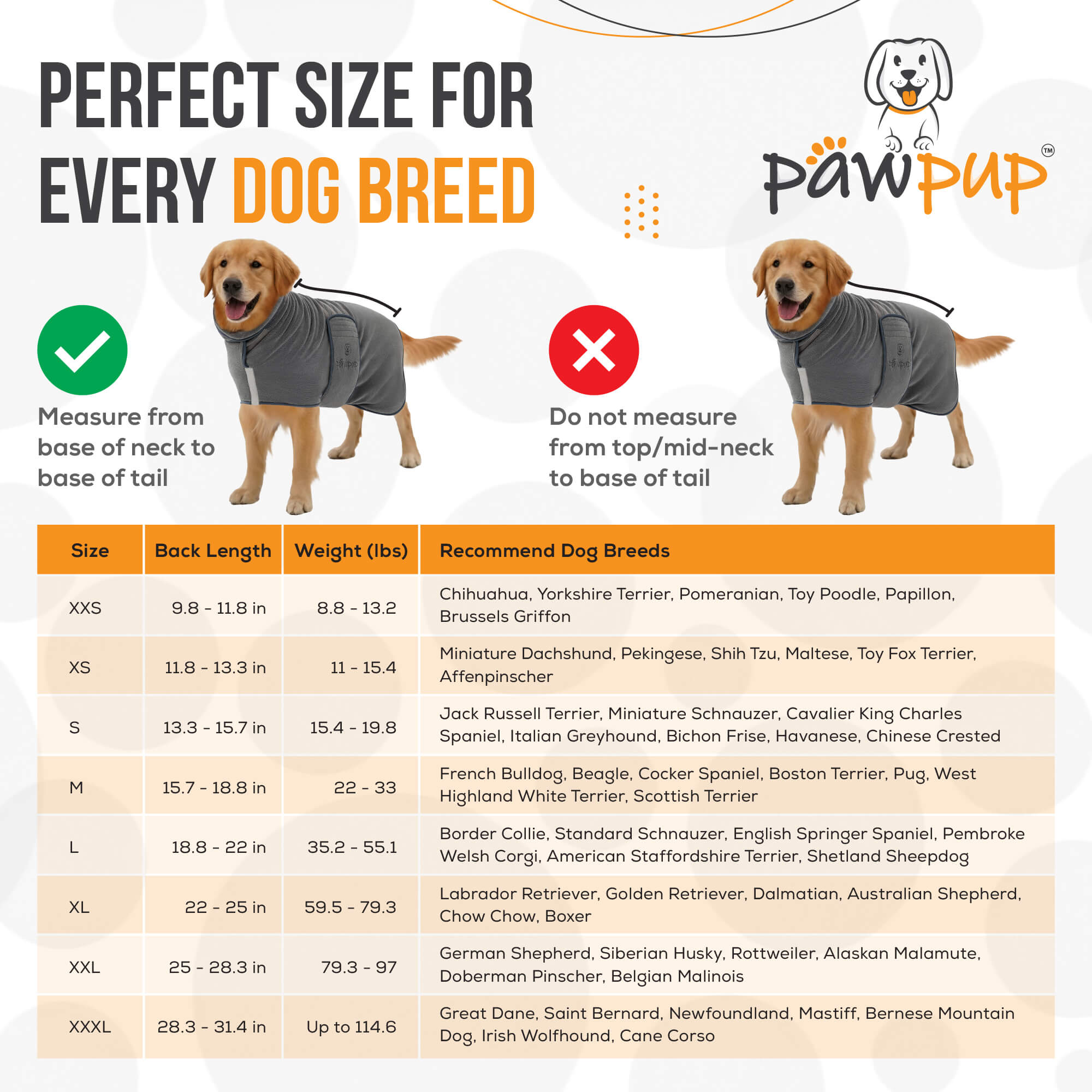 Tip: For the perfect fit, always measure your dog’s back length from the base of the neck to the base of the tail. If your dog is between sizes, we recommend sizing up for a more comfortable fit.
